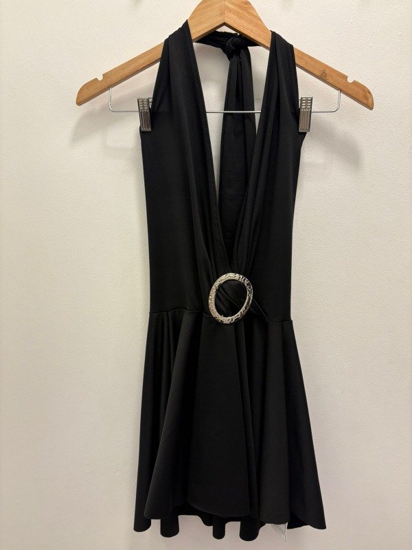Vestido corto con escote profundo y espalda completamente descubierta. Confeccionado en lycra suave y liviana, aporta caída fluida y un movimiento elegante. Lleva un aro metálico frontal que realza la silueta y un lazo al cuello para un ajuste cómodo y femenino. Ideal para noches de verano o eventos especiales.